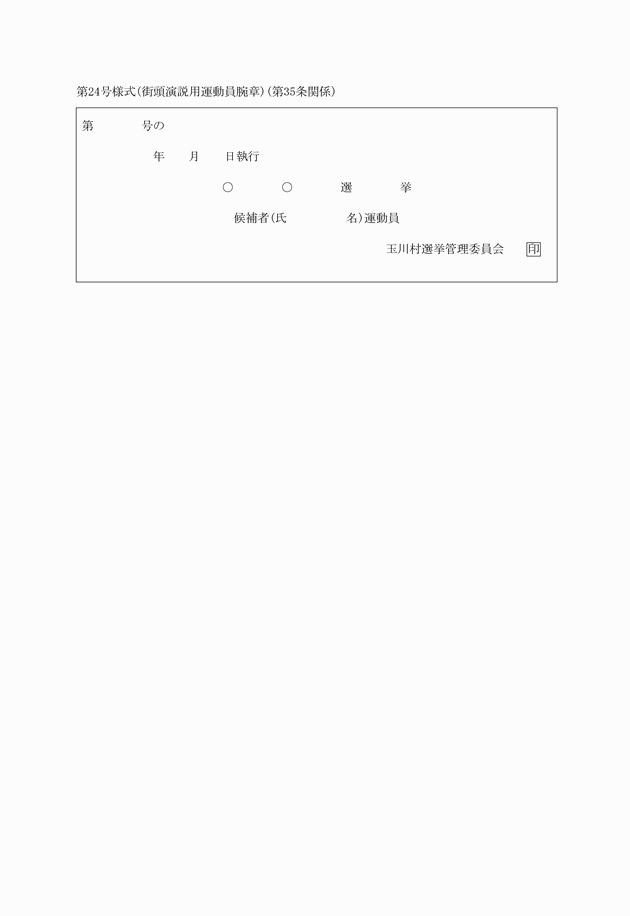 第24条の1 玉川村ポスター掲示場の設置に関する条例(平成3年玉川村条例第2号)第1条の規定するポスター掲示場(以下「掲示場」という。)は、委員会が第13号の2様式(又は第13号の3様式)に準じて作成し、独立して設置するものとする。ただし、既存の構築物の一部を利用して設置することができる。