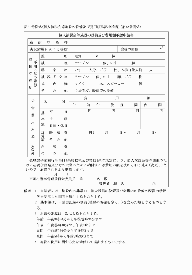 第22条 法第142条第7項の規定による玉川村長の選挙における候補者の頒布するビラ(以下この款において「候補者用ビラ」という。)の届出は、第10号様式に準じて作成した文書でしなければならない。