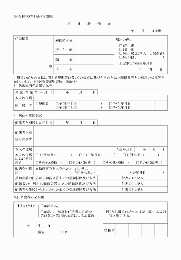 第9条の5 新たに条例第11条の2第1項の職員たる要件を具備するに至った職員は、当該要件を具備していることを証明する書類を添付して、住居届(第2号様式)によりその居住の実情を速やかに任命権者に届け出なければならない。住居手当を受けている職員の居住する住宅、家賃の額等に変更があった場合についても同様とする。