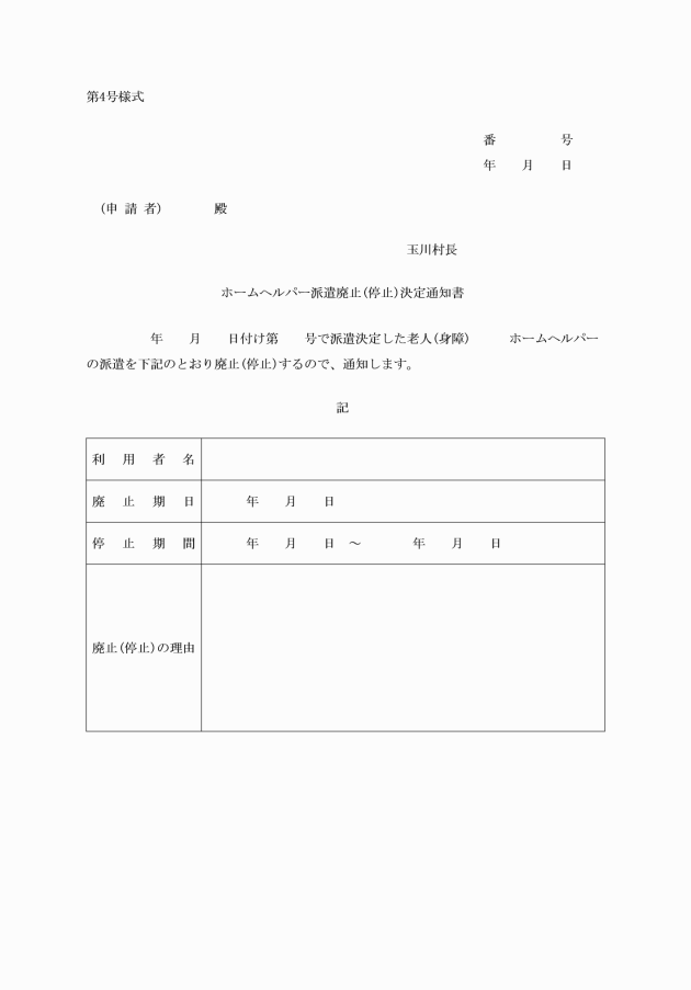 第8条 村長は、派遣を決定した対象者の死亡、入院、その他ホームヘルパーを派遣することが不適当と認められる場合には、これを廃止又は停止することができる。
