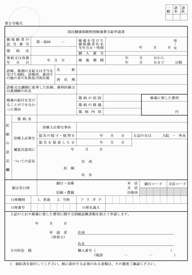 第14条 被保険者が、規則第28条第1項の規定による特別療養給付を受けようとするときは、国民健康保険の資格喪失後10日以内に、様式第13号による国民健康保険特別療養費給付支給申請書を提出しなければならない。