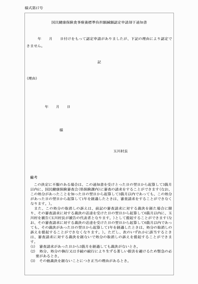 第16条 世帯主が、規則第28条の3に規定する食事療養費に係る標準負担額減額の認定を受けようとするときは、様式第15号による国民健康保険食事療養標準負担額減額認定申請書を提出しなければならない。