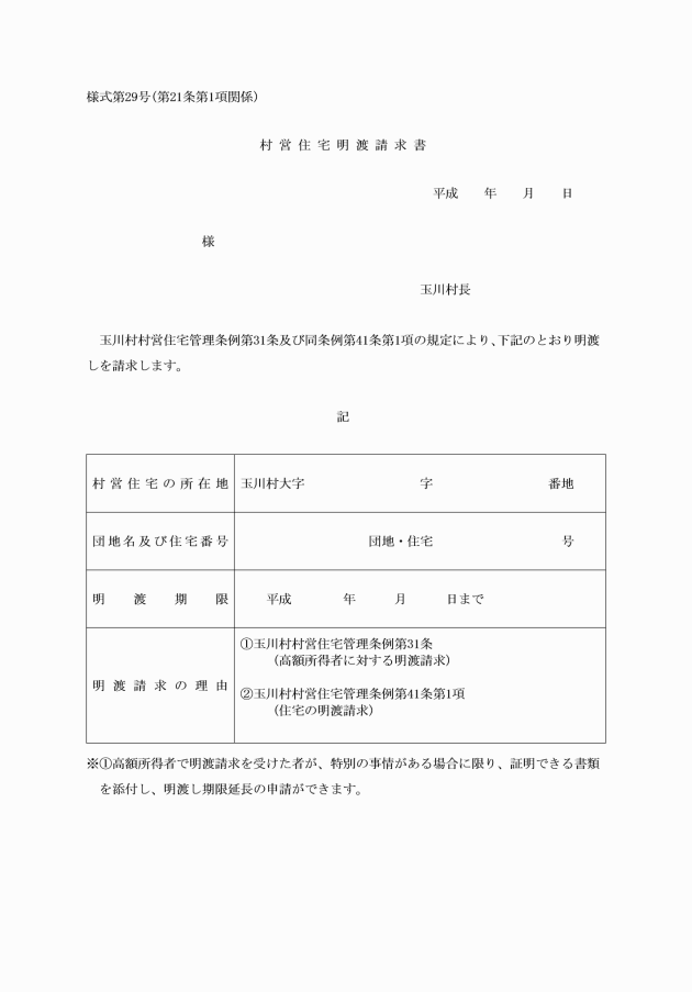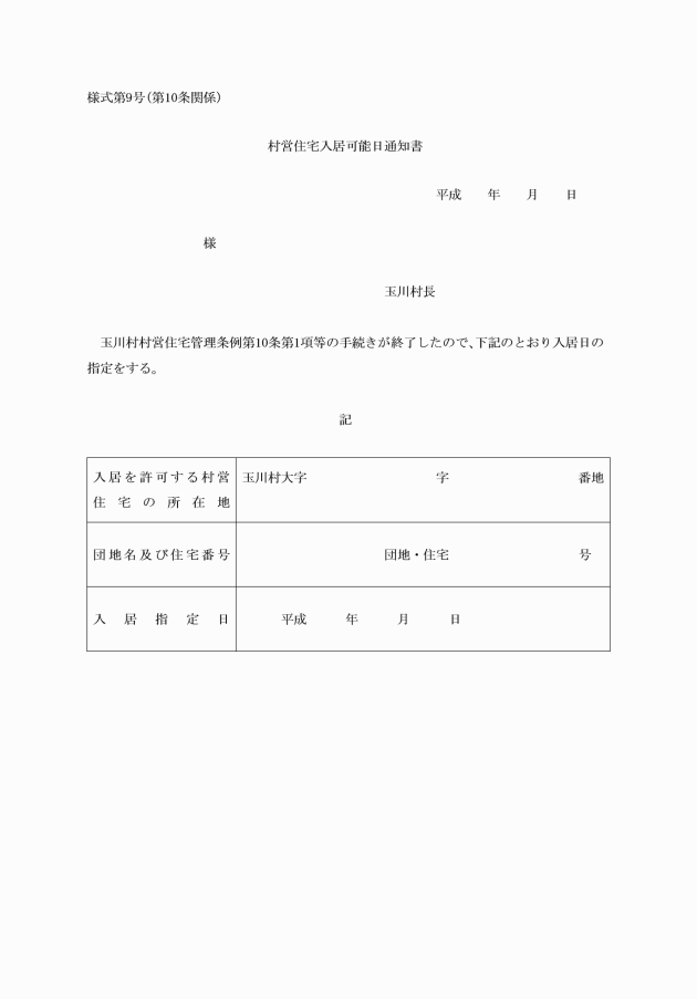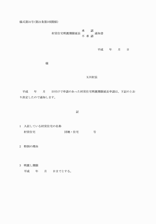 第6条 村営住宅への入居を許可された者が入居を辞退しようとするときは、村営住宅入居辞退届(様式第3号)を村長に提出しなければならない。