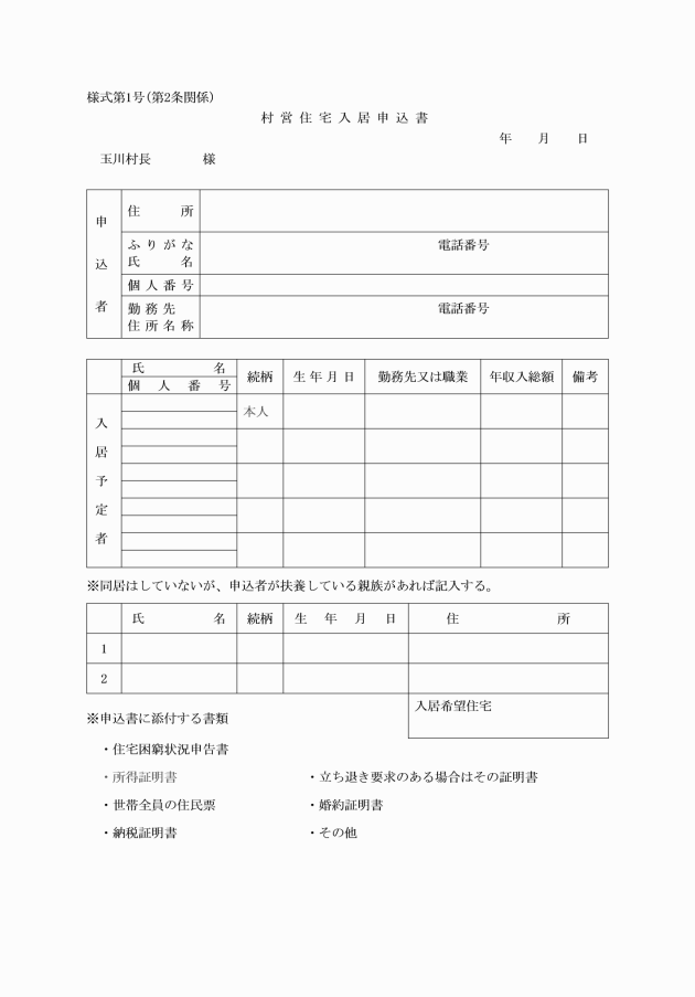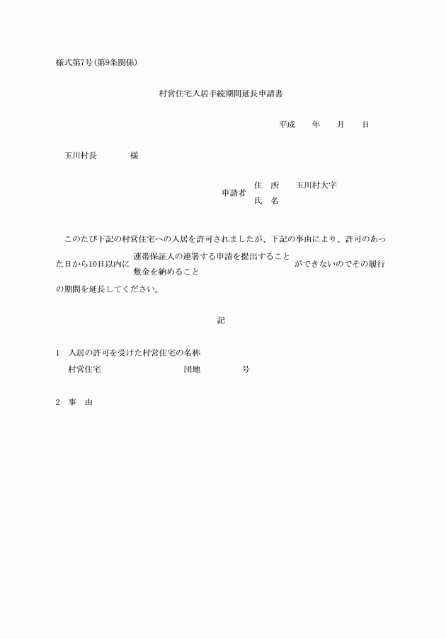 第7条 村営住宅の入居者は、政令第5条第3号若しくは第4号又は第33条第4号若しくは第5号に該当する場合には、村営住宅入替入居許可申請書(様式第4号)を村長に提出することができる。