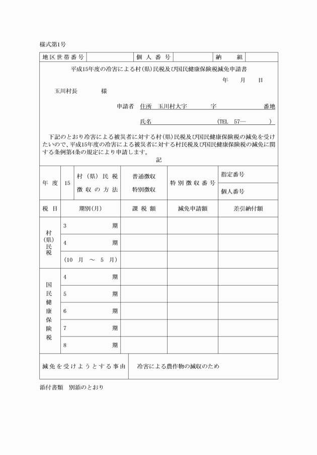(1) 平成15年度の冷害による村(県)民税及び国民健康保険税減免申請書 様式第1号