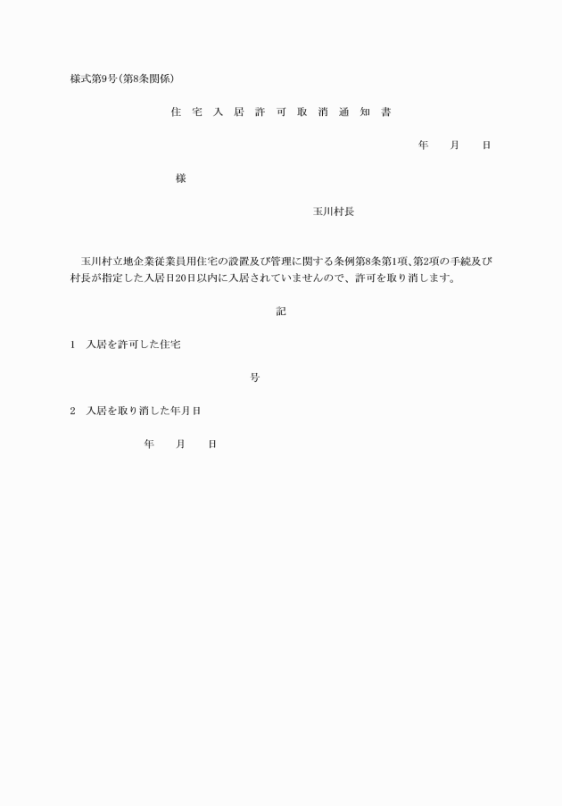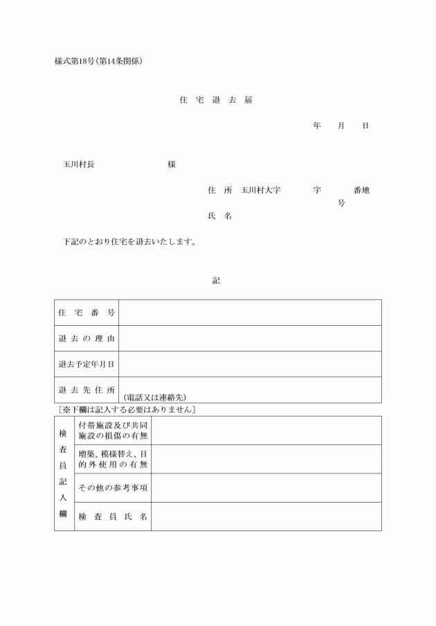 第4条 住宅への入居を許可された者が入居を辞退しようとするときは、住宅入居辞退届(様式第4号)を村長に提出しなければならない。