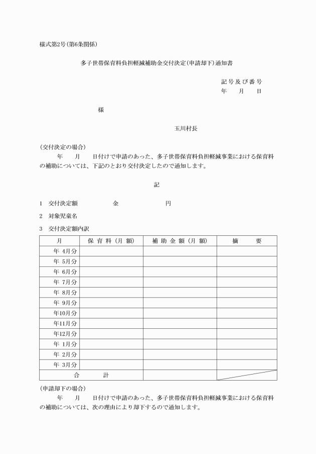 ○玉川村多子世帯保育料負担軽減補助金交付要綱