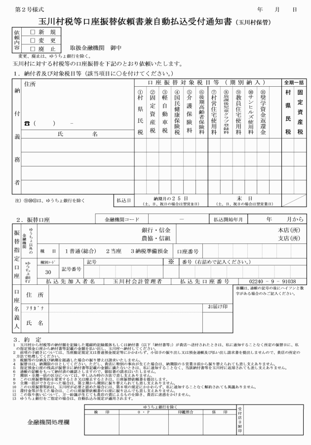 2 取扱金融機関は、納付義務者から振替依頼を受理した場合には、記載事項等を確認のうえ、確認印を押印して、村長に送付するものとする。