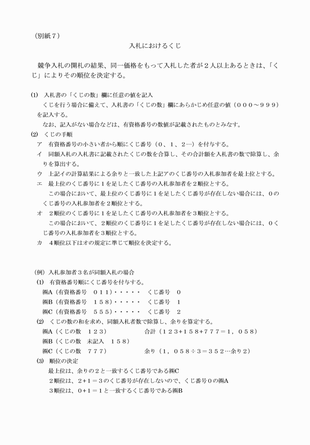 第11条 同じ価格をもって入札した者が2人以上あるときは、別に定める「入札におけるくじ」の方法によりくじを行い、落札者を決定する。