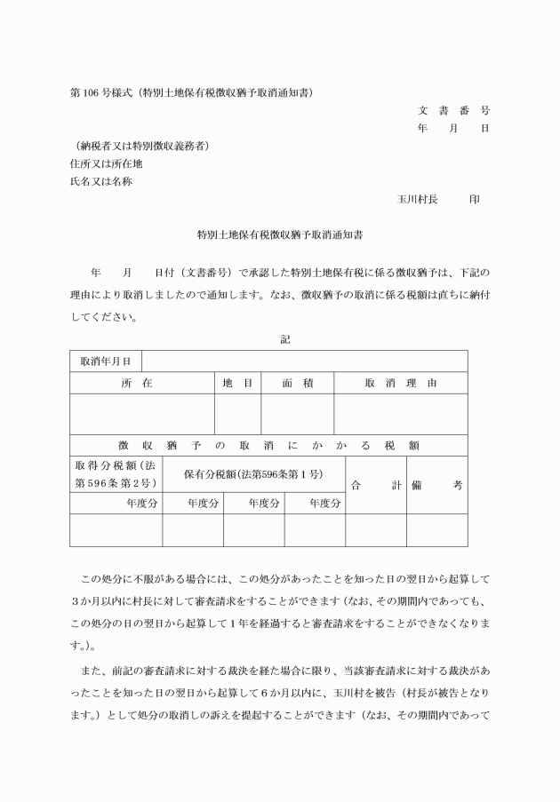 第84条 法第601条第5項の規定による徴収猶予の取消通知書は、特別土地保有税徴収猶予取消通知書(第106号様式)による。