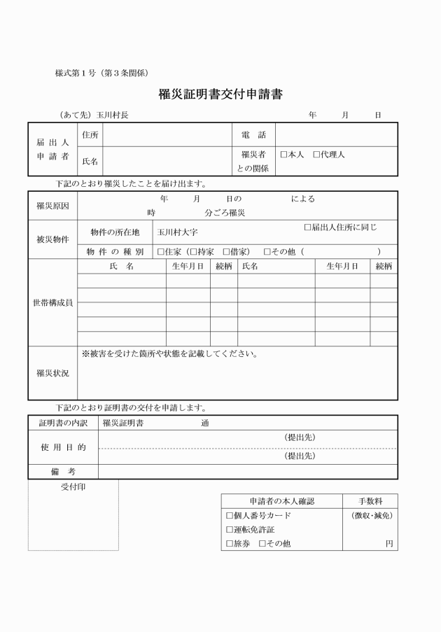 第3条 証明書の交付を受けようとする者(以下「申請者」という。)は、罹災証明書交付申請書(様式第1号。以下「申請書」という。)を村長に提出しなければならない。