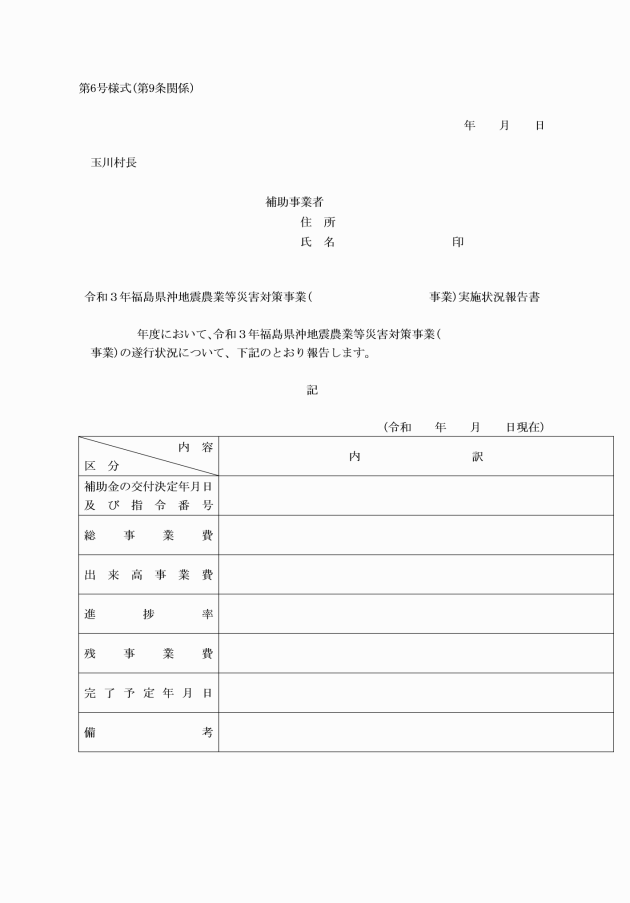 3 補助事業者等は、当該事業が完了したときは速やかに令和3年福島県沖地震農業等災害対策事業完了報告書(第7号様式)を村長へ提出しなければならない。