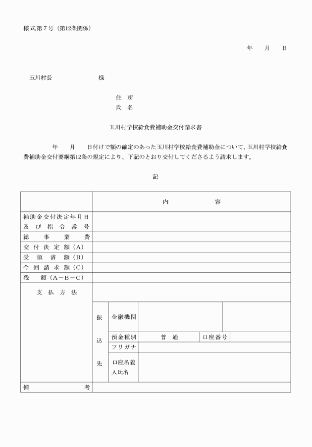 第6条 規則第6条第1項第1号又は第2号の規定に基づき村長の承認を受けようとする場合は、玉川村学校給食費補助金変更(中止、廃止)承認申請書(様式第2号)を村長に提出しなければならない。