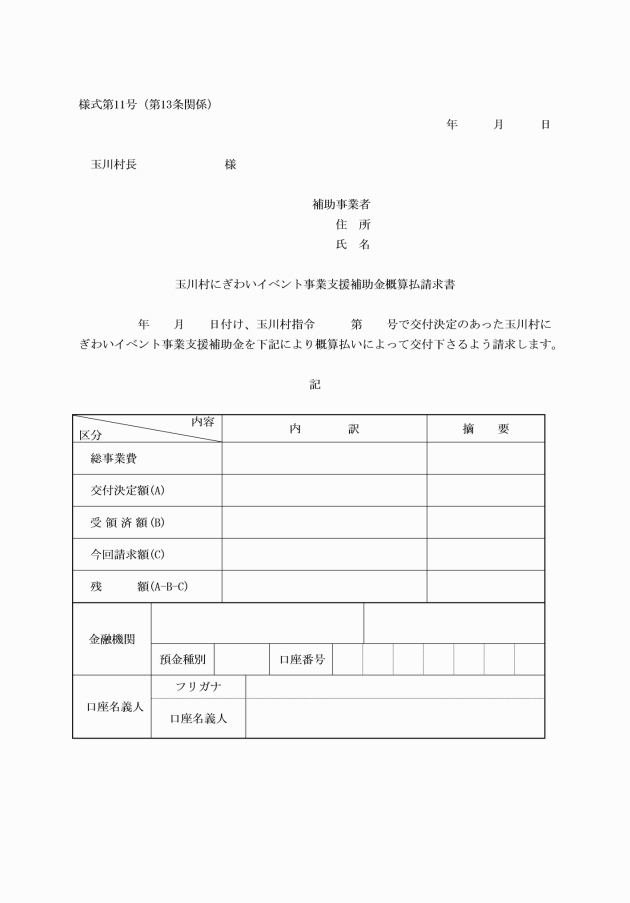 第11条 補助金の交付の決定を受けた補助事業者は、イベントが終了したときは、30日以内に玉川村にぎわいイベント事業支援補助金実績報告書(様式第6号)に次に掲げる書類を添えて、村長に提出しなければならない。