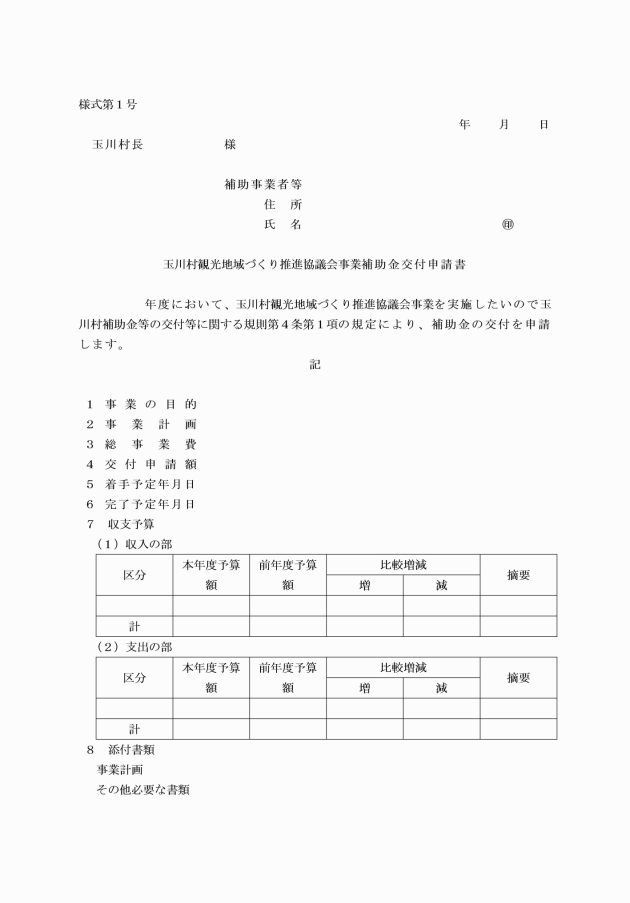第6条 会長は、規則第6条第1項第1号又は第2号の規定に基づき村長の承認を受けようとする場合は、玉川村観光地域づくり推進協議会事業変更(中止、廃止)承認申請書(様式第2号)を村長に提出しなければならない。