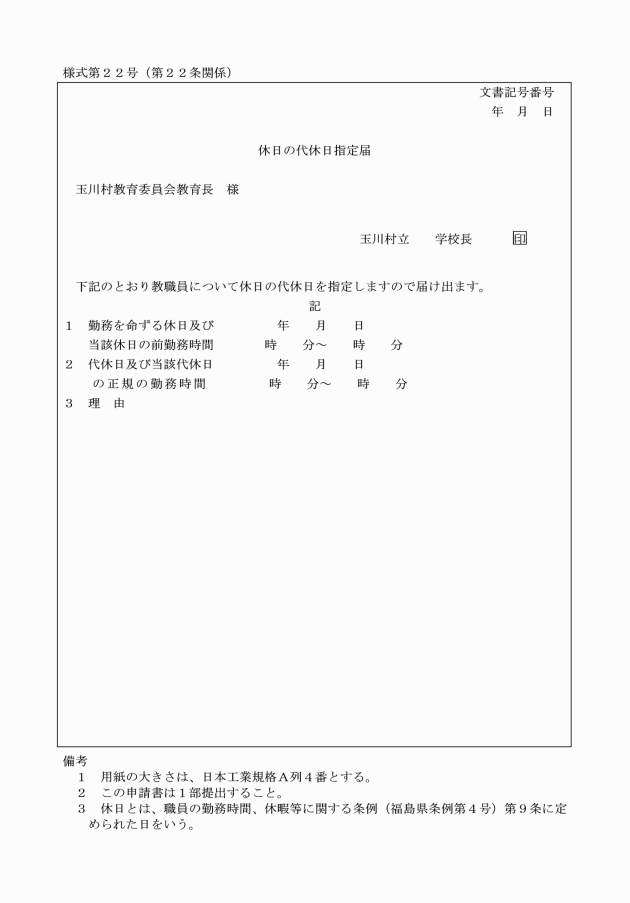 第27条 校長及び職員は、5日以上に渡って私事旅行をするときは、私事旅行届(様式第29号)を、校長は教育長に、職員は校長に提出しなければならない。