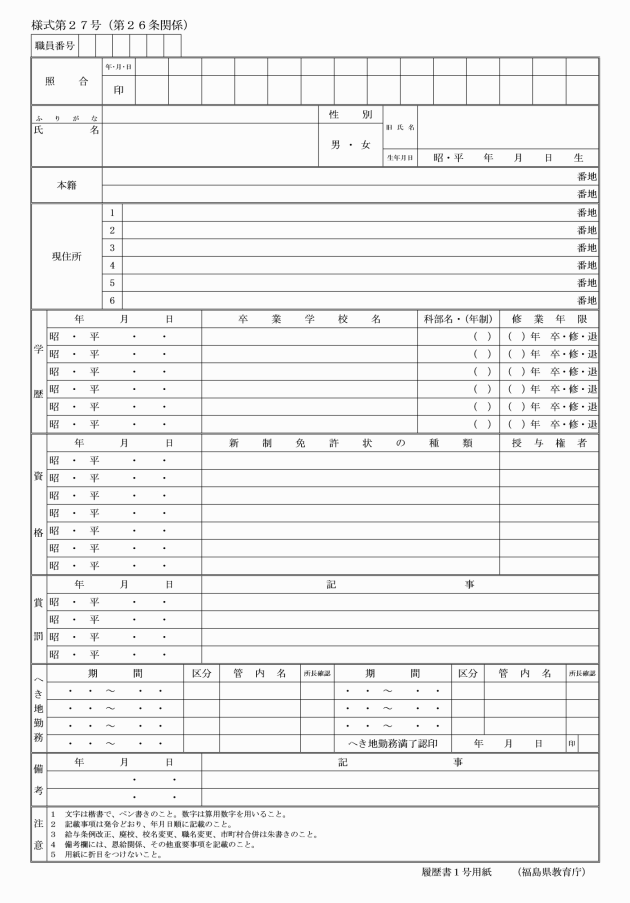 第26条 新たに職員となった者は、速やかに履歴書(様式第27号)を4部(期限付採用の職員にあっては3部、非常勤の職員については2部)作成し、校長に提出しなければならない。