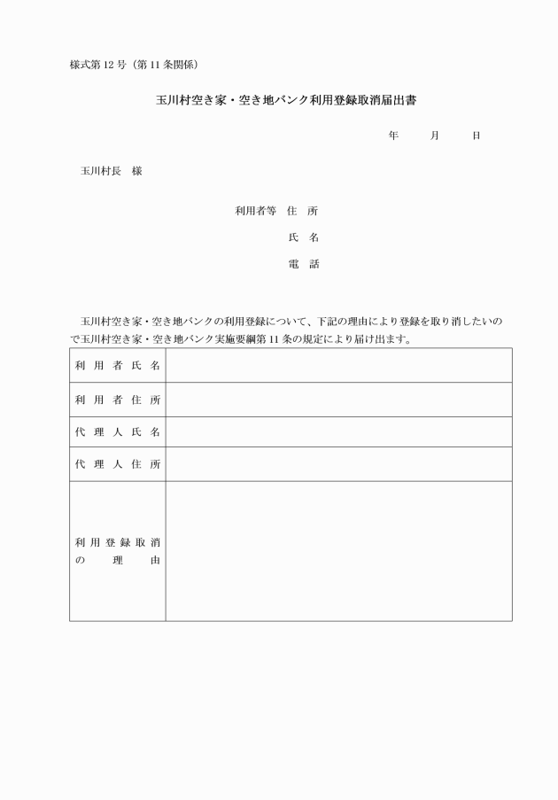 第11条 利用者等は、当該利用登録を取り消すときは、玉川村空き家・空き地バンク利用登録取消届出書(様式第12号)を村長に届け出なければならない。