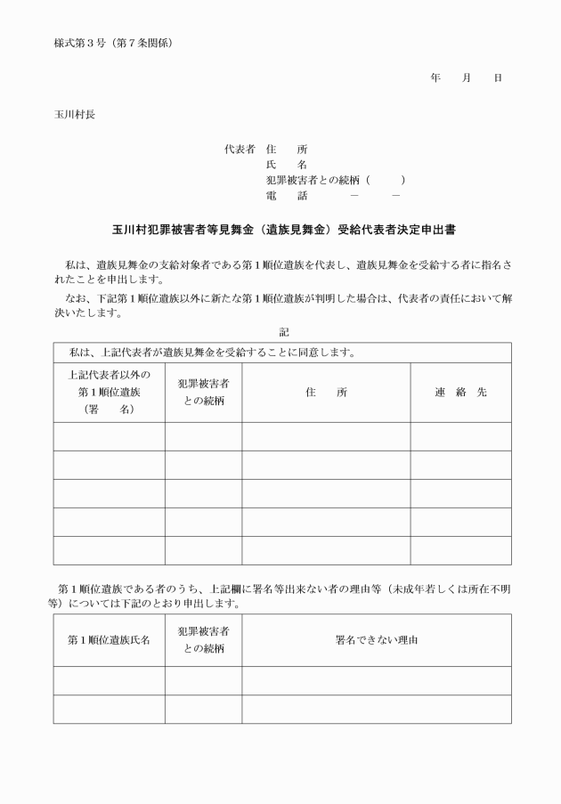 (8) 遺族見舞金の支給を受けることができる遺族が2人以上あるときは、玉川村犯罪被害者等見舞金(遺族見舞金)受給代表者決定申出書(様式第3号)